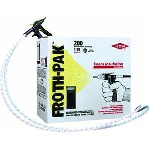 Froth-Pak 200 Spray Foam Sealant SystemA professional use, 2 component polyurethane spray foam system. Typically used as a foam-insulating sealant to fill cavities, wall and floor penetrations, cracks, and expansion joints. Chemical curing allows 2 part polyurethane foam to be dispensed, expand, and become tack-free in seconds. Will skin over in 30-40 seconds and be completely cured in under 1 minute. Froth-Pak 200 kit includes: Iso (A) cylinder, Polyol (B) cylinder, 6 cone white spray nozzles (187918), 4 GG white spray nozzles (187915), 9´ gun hose assembly (GHA), petroleum jelly packet. Froth-Pak 200 is great for bigger jobs; yield is 200 board ft. at 1" thickness. Class 1 rated.View Dow Chemical Companys website for details and warranty information on this product.